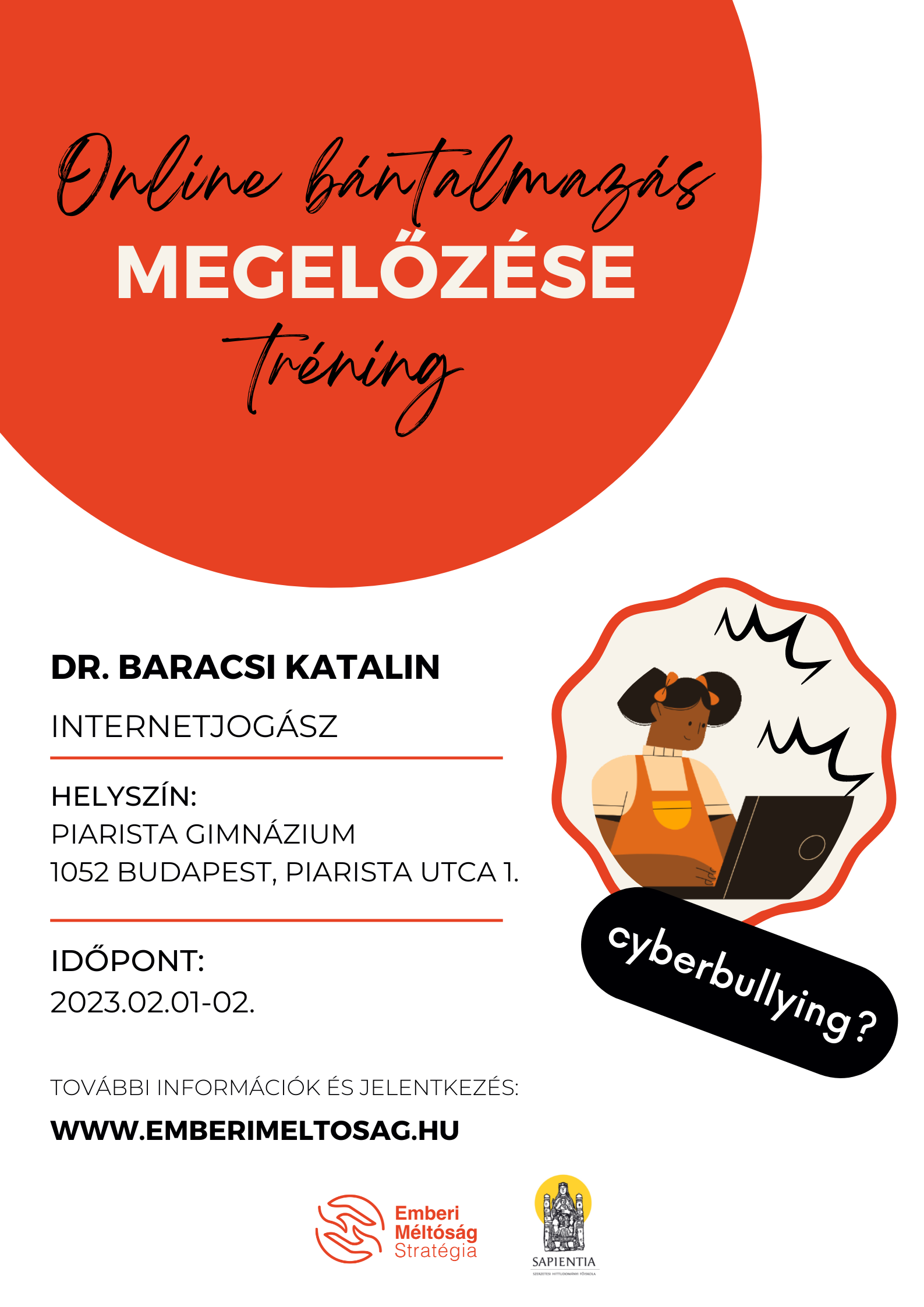 Évek óta az egyik legtöbbször emlegetett veszélyforrás életkortól függetlenül az internetes bántalmazás, azaz a cyberbullying. A képzés során annak járunk utána, hogy mit is jelent ez a fogalom, milyen formában lehetünk áldozatai és/vagy elkövetői egy online bántalmazásnak és ezeknek milyen következményei vannak a való életre. Időbeni felismerés, megelőzés, segítségkérés lesznek a képzés jelmondatai.